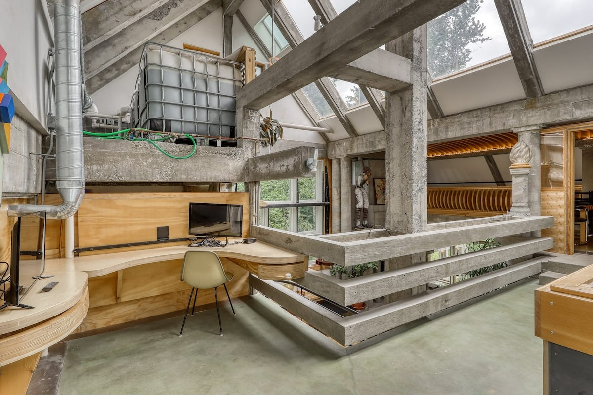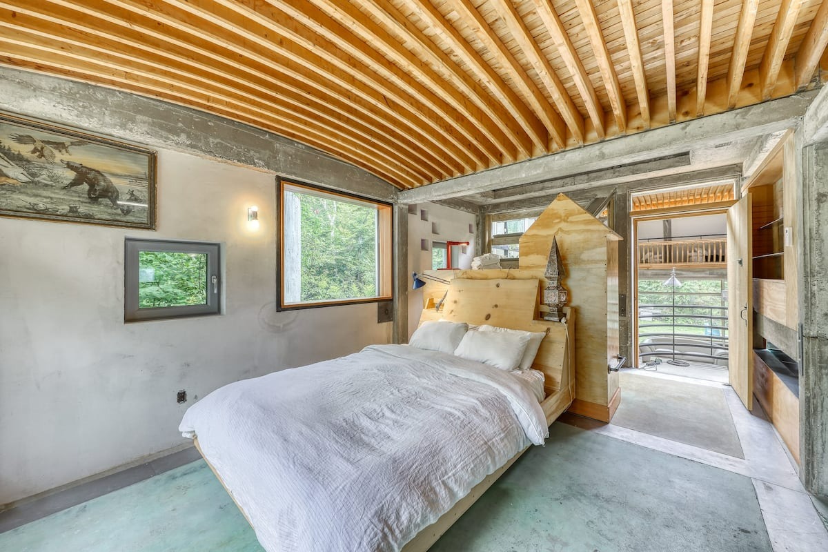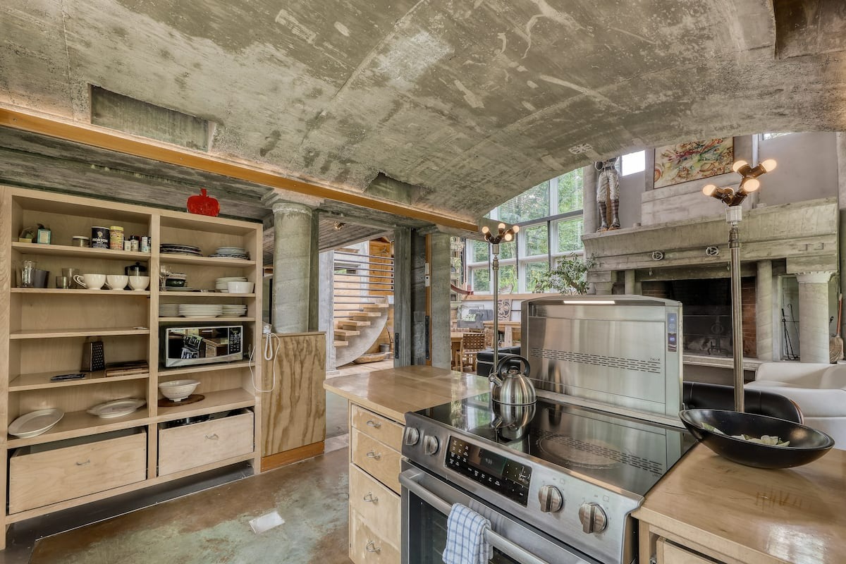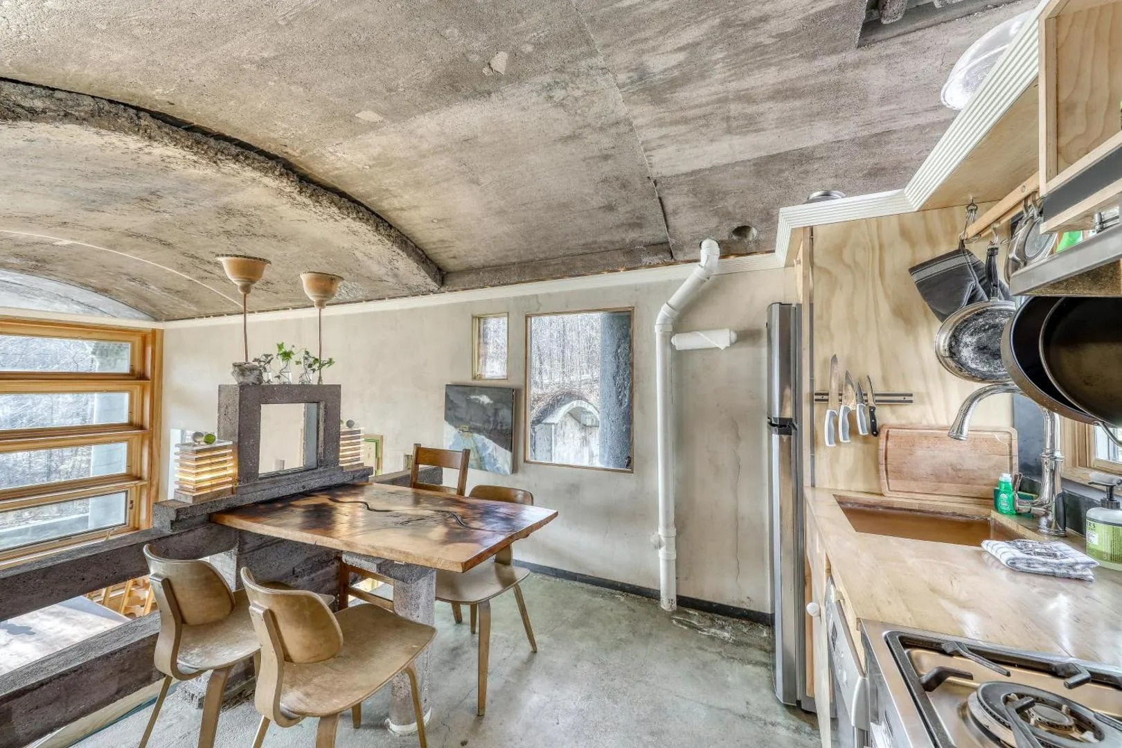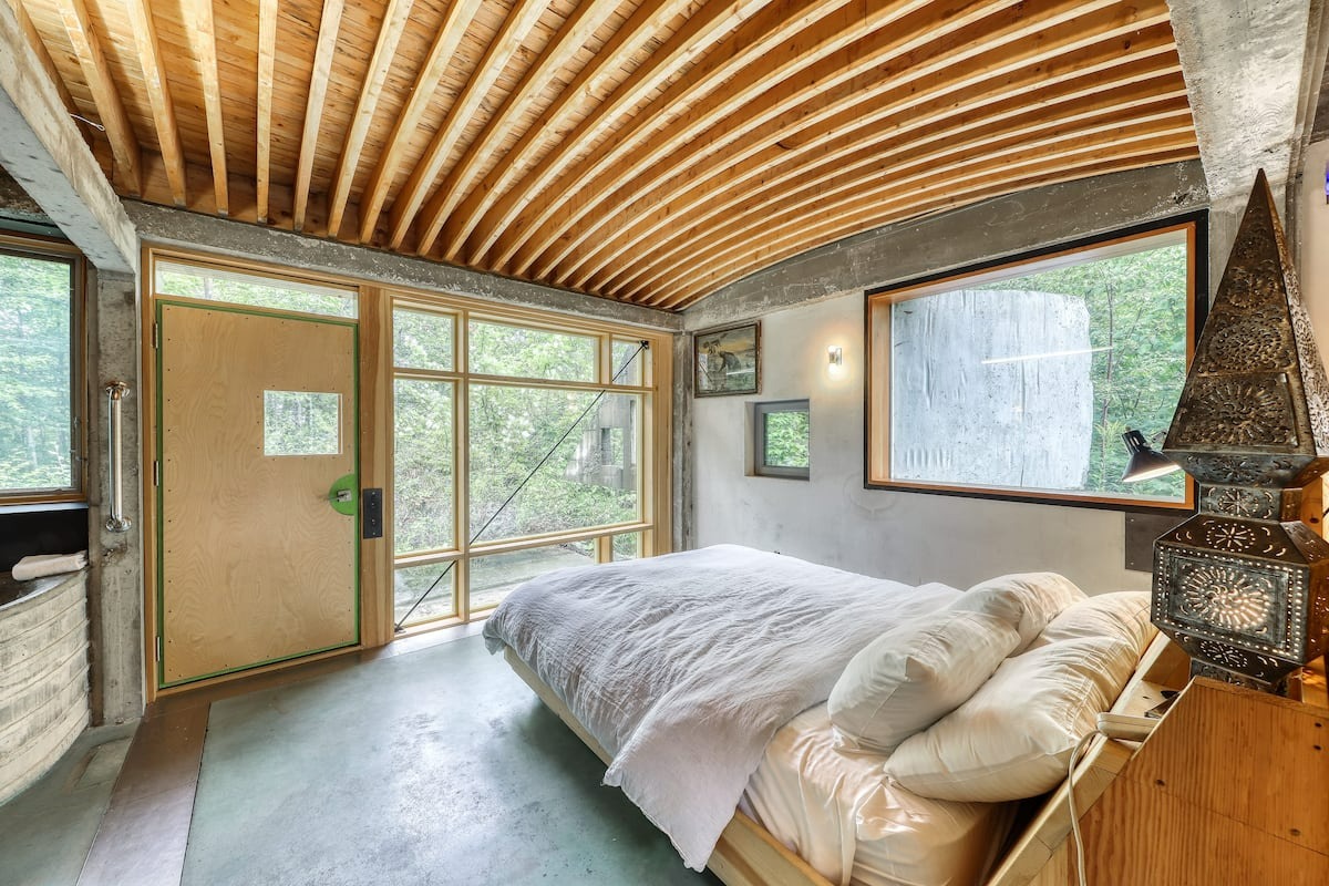 Built collaboratively with students from Yestermorrow, the home showcases sculptural forms, arched ceilings, cantilevered elements, and richly textured concrete throughout its 1,100 square feet.