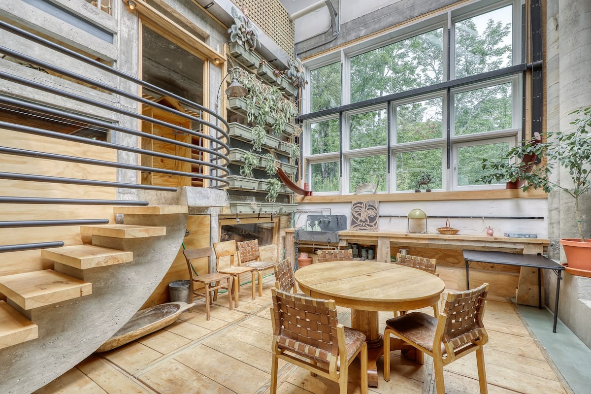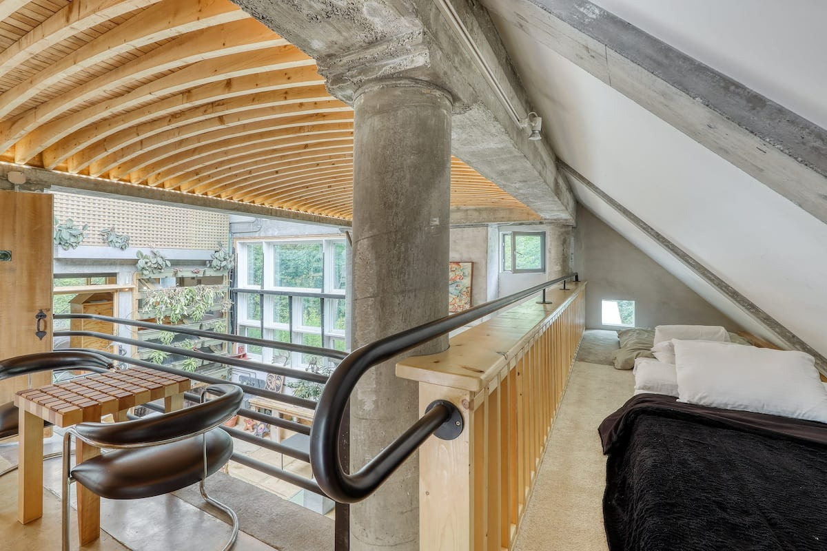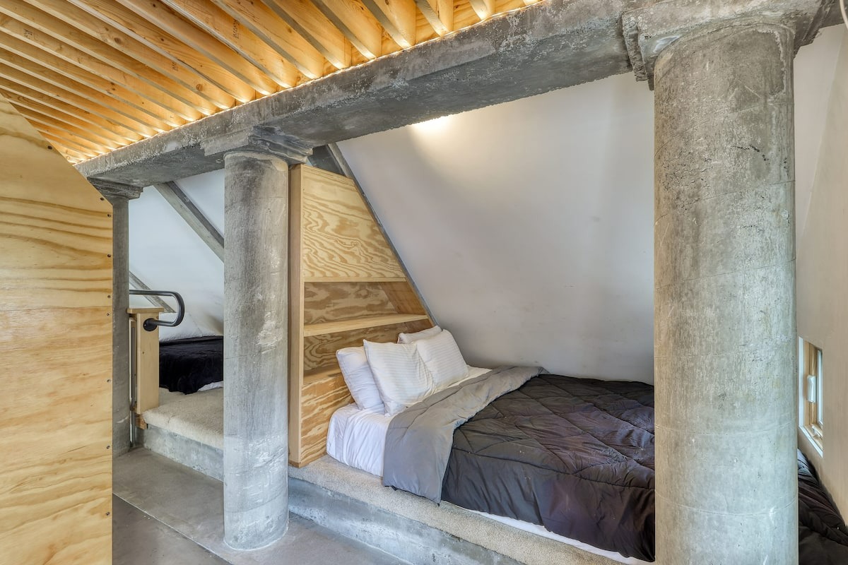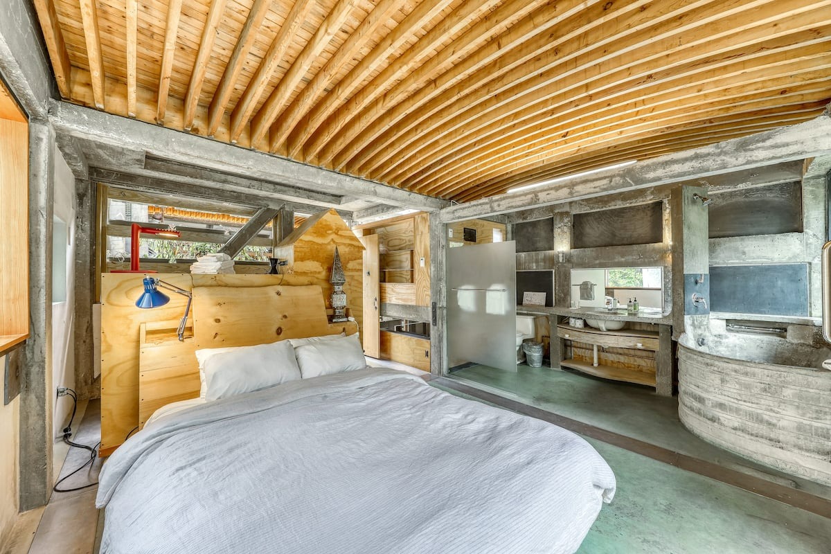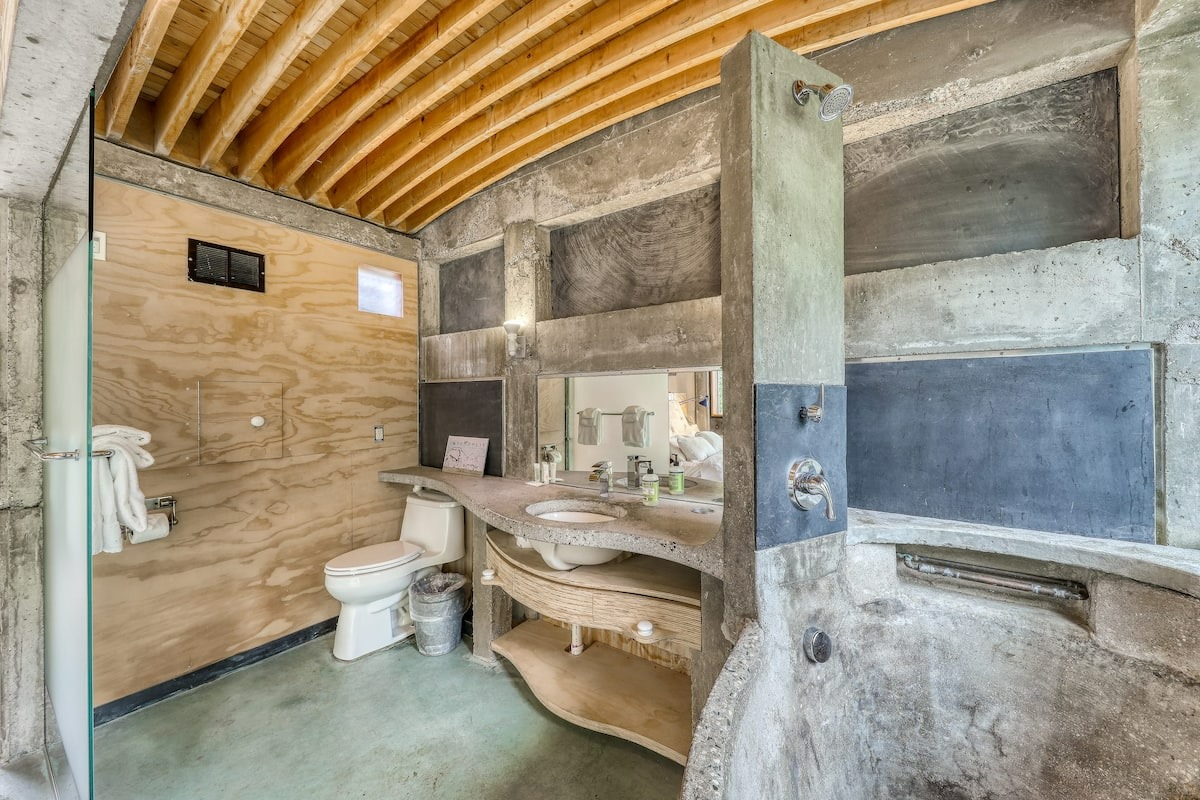 Built collaboratively with students from Yestermorrow, the home showcases sculptural forms, arched ceilings, cantilevered elements, and richly textured concrete throughout its 1,100 square feet.