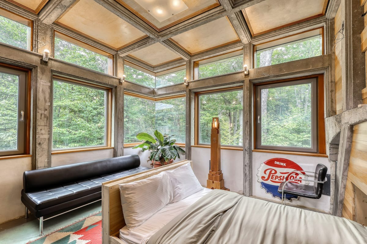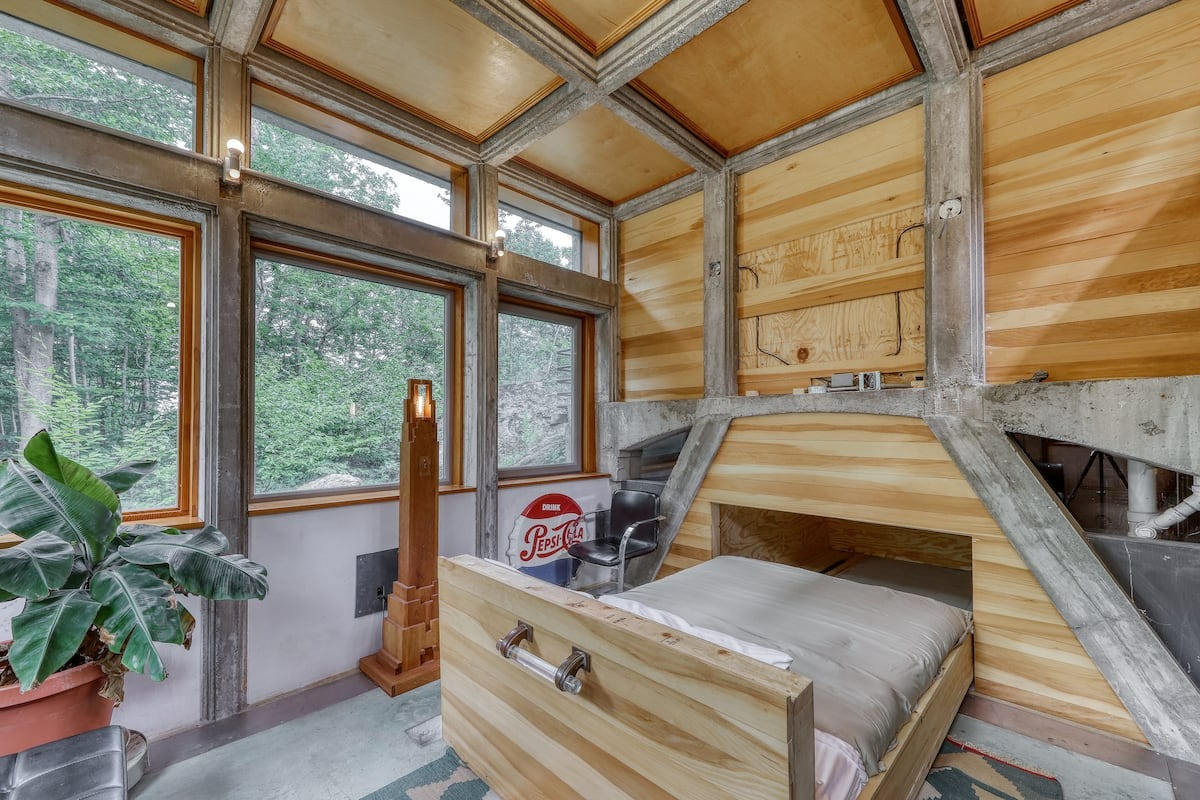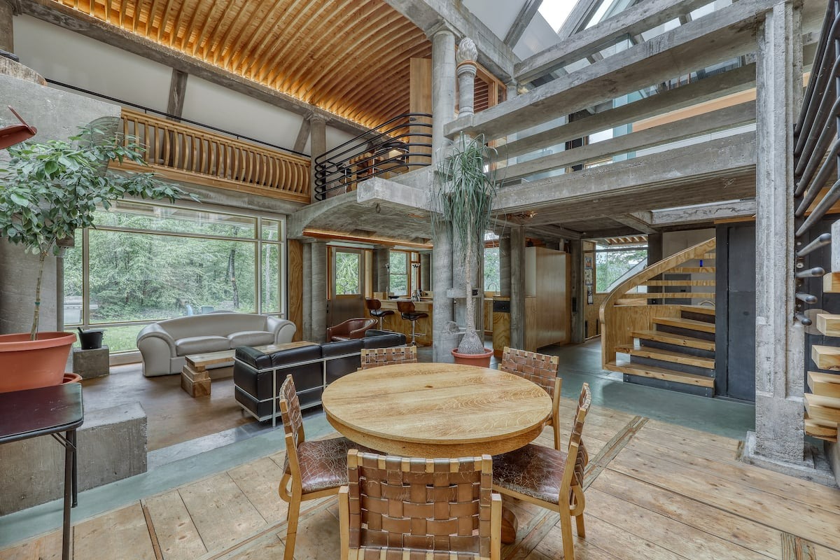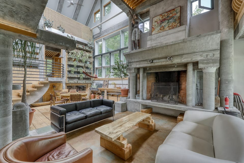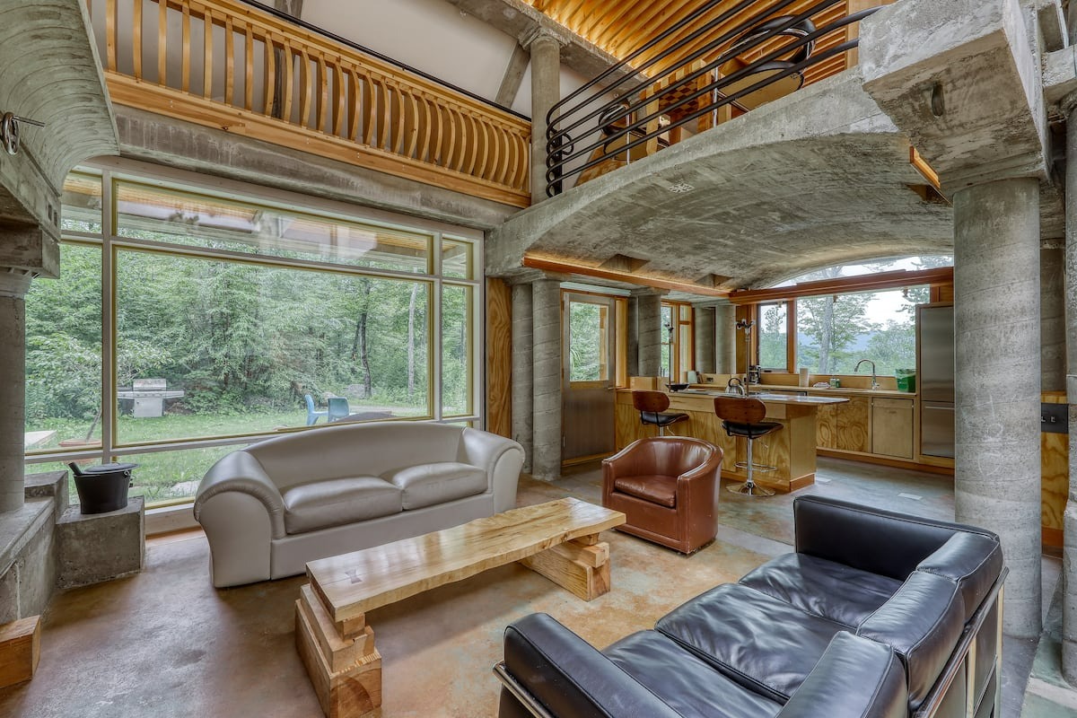 Minutes from Sugarbush, Architect Dave Sellers’s iconic “Archie Bunker” is a striking high-concept concrete home celebrated for its bold design and artistic vision.