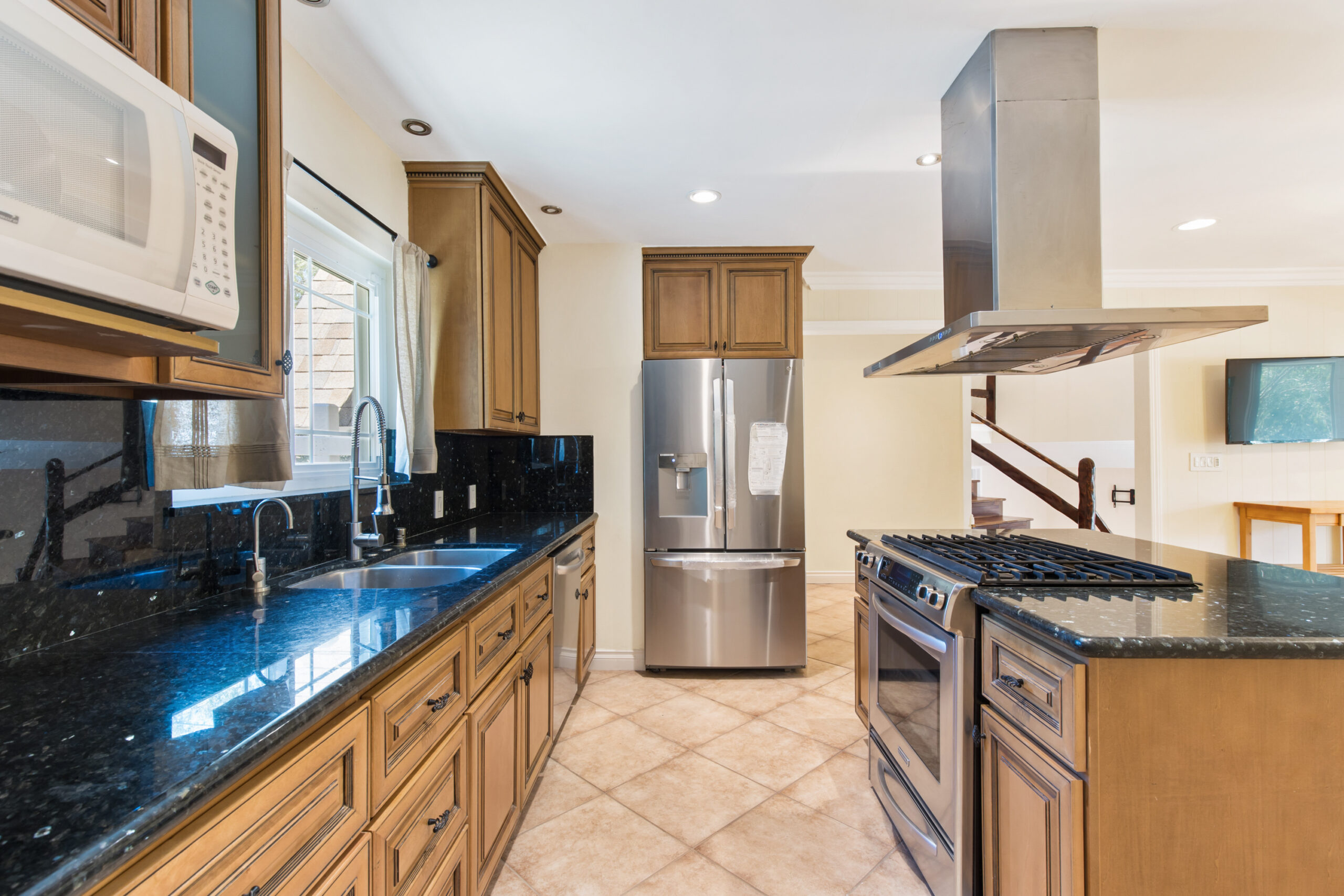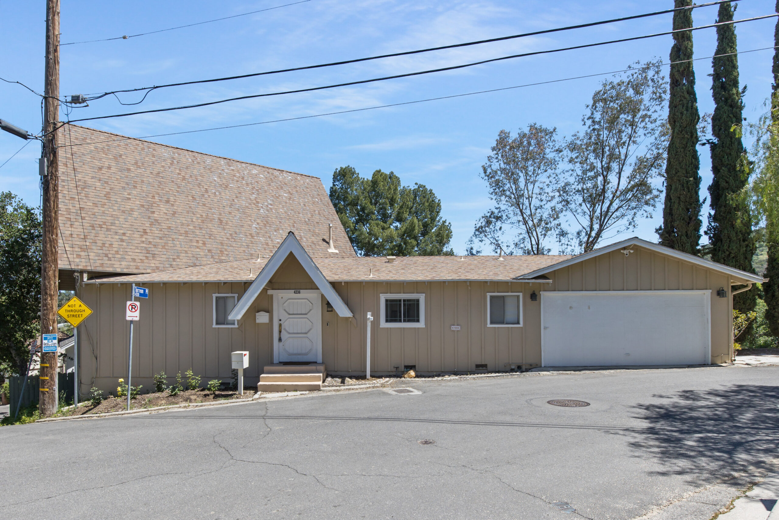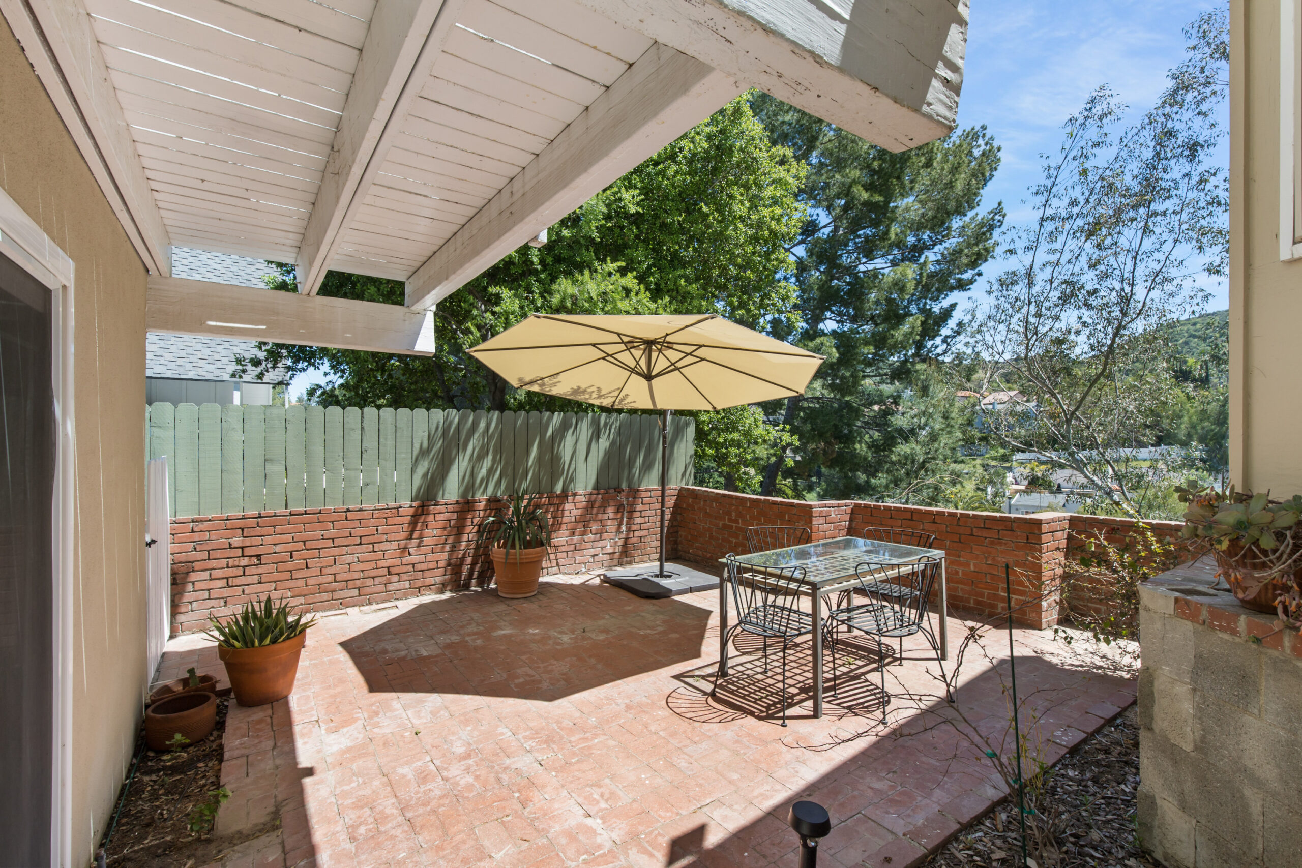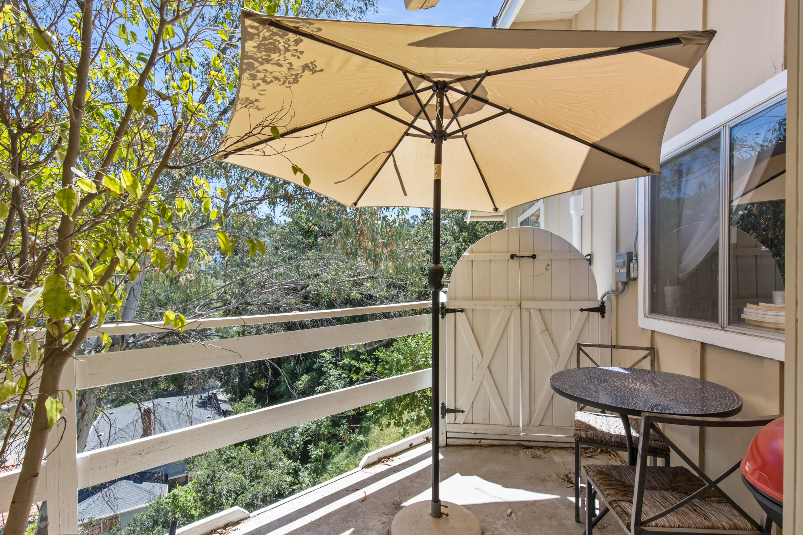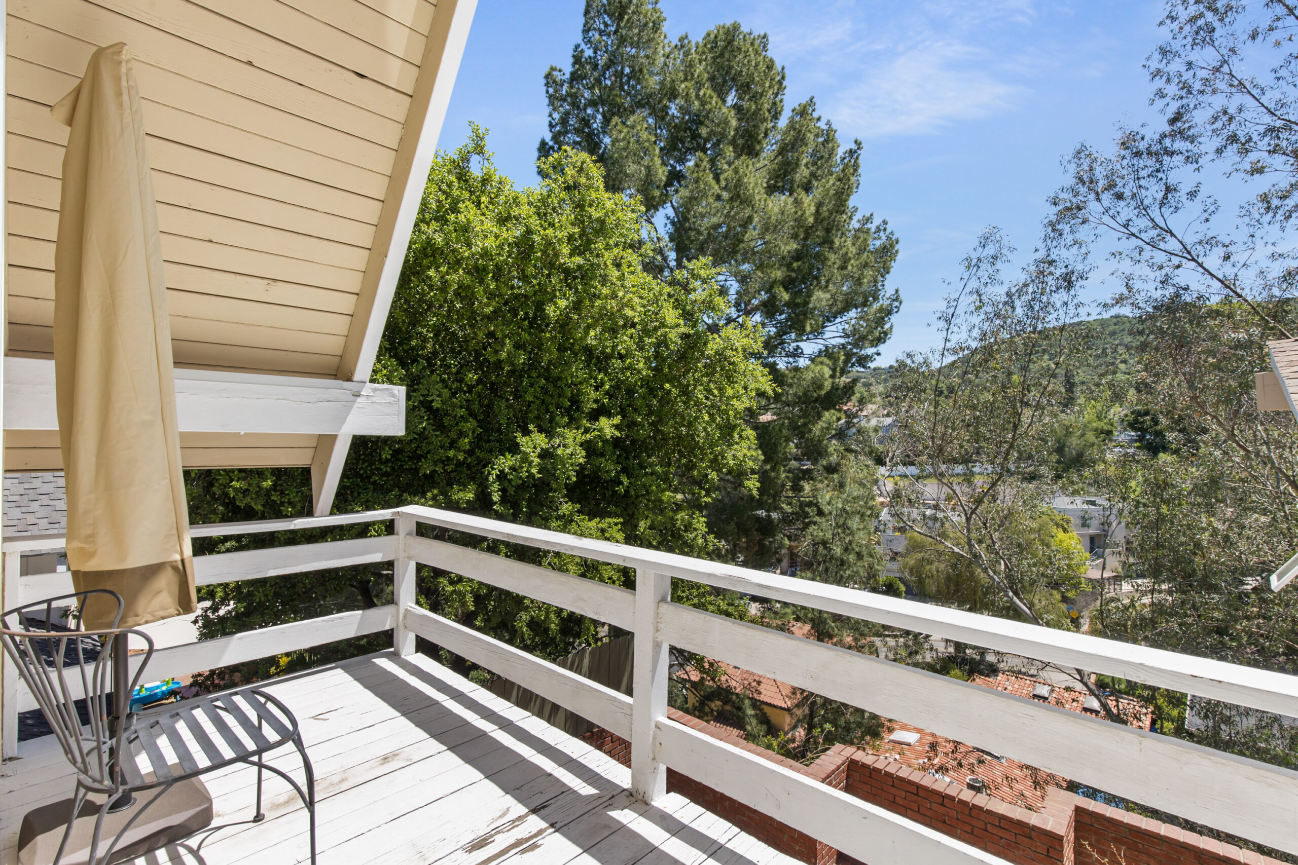 Charming storybook chalet with beautiful mountain views in peaceful Woodland Hills. Traditional post and beam construction w/ contemporary flair, character and charm. Light, bright, airy, with a split-level design and open floor plan. 4 BR/2 BA with hardwood floors & crown moldings. 2 beds up and 2 beds down. Updated kitchen has custom cabinets, granite counters, stainless appliances, recessed lighting and an island along with a KitchenAid triple-tier burner and convection oven. Dining room opens to spacious sunroom with high ceiling & nature views. Step down living room is warm and inviting with a decorative fireplace, and opens to a patio. Bathrooms have been updated w/ new vanities. Upstairs bedrooms and bathroom have vaulted ceilings and ceiling fans. Non-covered parking spots for two cars. Easy street parking with no street sweeping restriction. Other amenities include Double-glazed windows, USB-A & USB-C outlets in every room, Smart Ecobee Thermostat, Hillside views from master bedroom balcony, 24/7 professional security monitoring – RING, Brand new LG french door stainless steel refrigerator, Instant Hot on-demand filtered water, One 43″ Smart FireTVDishwasher, garbage disposal, refrigerator, washer/dryer included. Great location, close to the 101 FWY, PCH, Topanga State Park hiking trails, Calabasas, Ventura Blvd, shops & restaurants! The Woodland Hills Country Club is only one mile away. Home is in the affluent area of Girard Tract neighborhood.